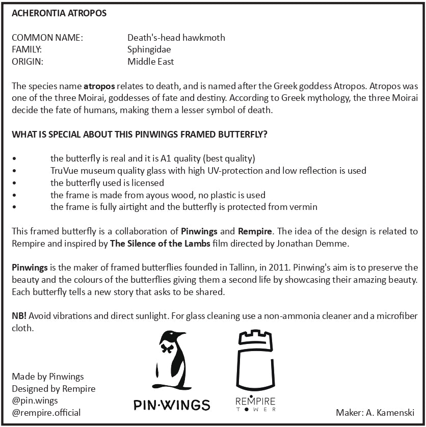 This unique limited edition decor - Dead Head butterflies inspired by the movie 'The Silence of the Lambs' - is a product of meticulous craftsmanship, with the utmost attention to detail. Each butterfly is handcrafted with love and precision to bring the atmosphere of dark classics and the world of cinema into your space. Our artist have brought each butterfly to life to make this decor truly special. Immerse yourself in the unique world of art and style with our Dead Head butterflies!"
